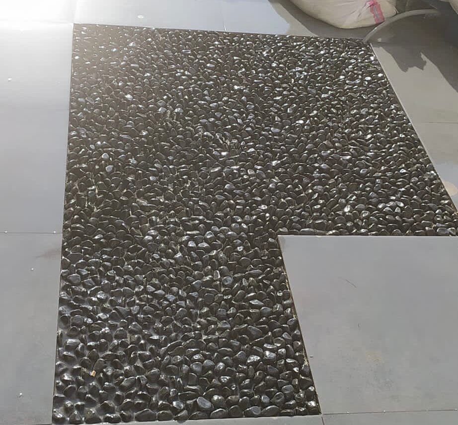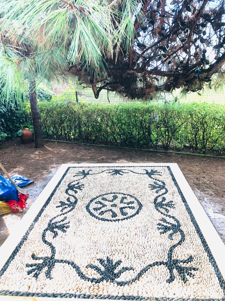 Çakıl taşlarından oluşan elle seçilmiş ve özenle ayıklanmış dekoratif doğal taş ve çakıl mozaik uygulamalar.